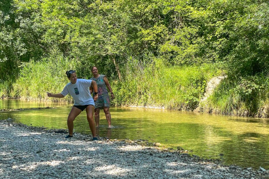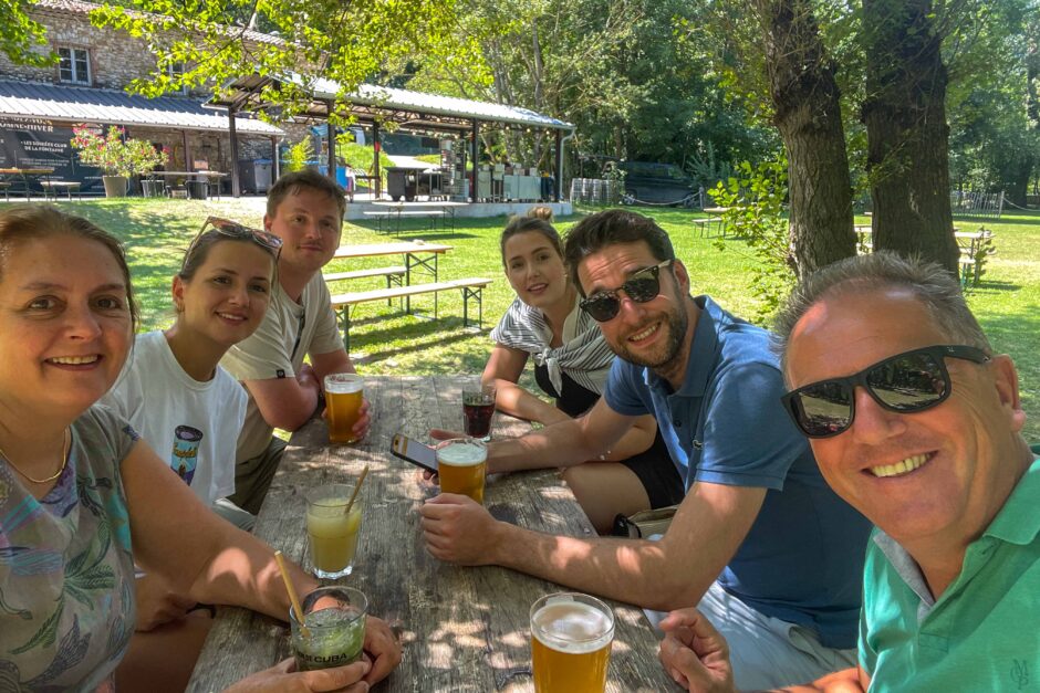 Aan het einde van de dag bezoeken we La Fontaine de Minéral. Om het maar ouderwets uit te drukken, een gezellige uitspanning gelegen aan een typisch Frans beekje. Op het lommerrijke grasveld staan allemaal tafels met banken opgesteld, lekker genieten hoor! Ineke en Jytte gaan in het beekje steentjes keilen, eens kijken wie het verst komt. Later schuift Robert aan om de dames te demonstreren hoe het echt moet!