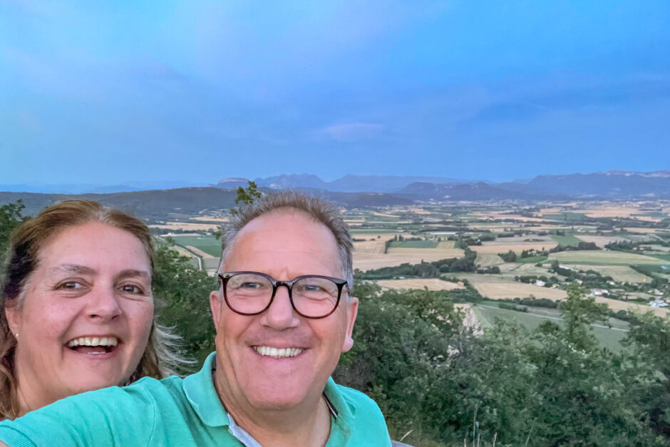 ‘s Avond maak ik met Ien nog een late wandeling. De berg op richting de ruïne van Marsanne en dan genieten van de ondergaande zon en het weidse uitzicht over deze uitgestrekte vallei. Het is nog goed warm voor een avondwandeling. Oeps… we zijn even de tijd vergeten en zo lopen we in het donker de berg af terug naar ons huis.
