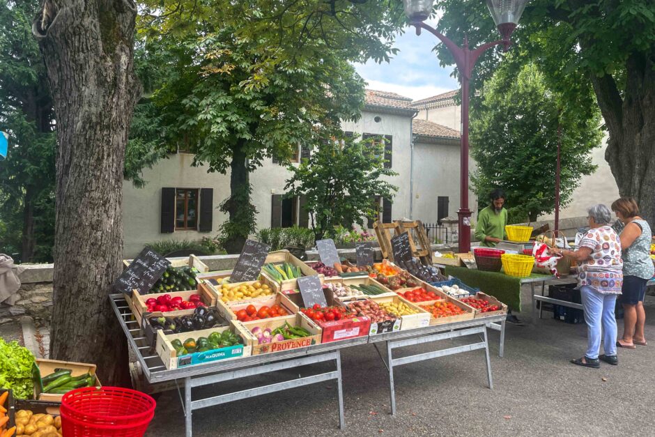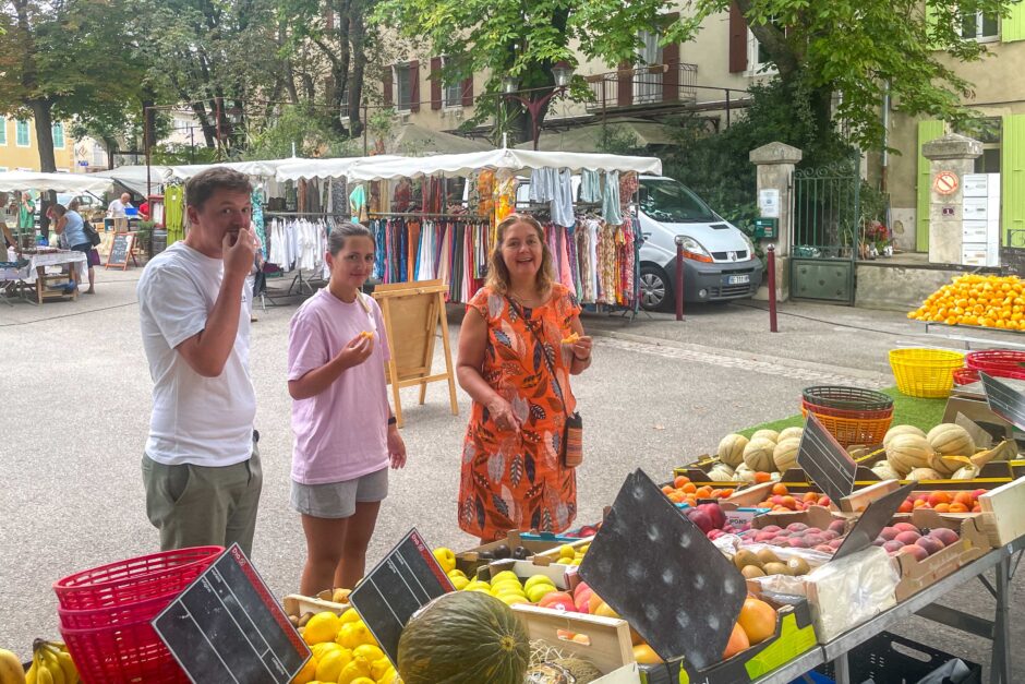 Vandaag staat er zo goed als niets op het programma, het is tenslotte ook nog eens vakantie. Met zo’n 33ºC is ook te warm om te gaan sporten. Dus we gaan lekker genieten van ons huis en het heerlijke zwembad. In de ochtend bezoeken we wel eerst (recht tegenover ons huis) de lokale weekmarkt van Marsanne. Deze heeft een iets andere omvang dan de markt in Nyons, met een kleine 10 kraampjes is het een charmante kleine markt met lokale producten uit de streek.
