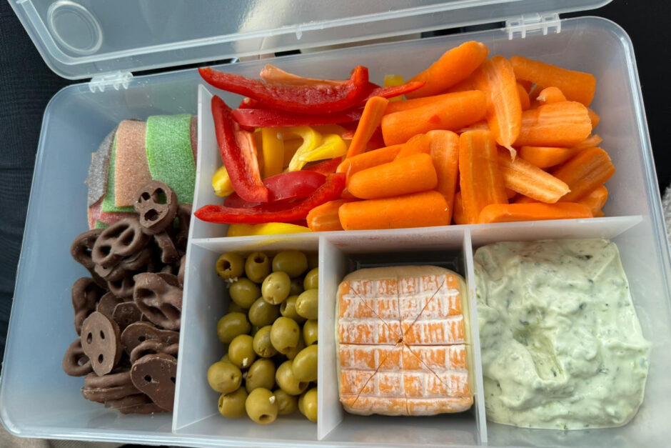 Vandaag vertrekken Myrthe en Roy richting Colmar, hun tijd in de Drôme zit er helaas op. Maar met voldoende lekkere wijn en bier in de auto gaan zij op zoek naar hun volgende avontuur. Myrthe heeft haar gezonde Mondriaan snackbox gevuld met Franse producten. Op de foto zie je de NL-versie van de snackbox, wat een geweldige uitvinding!