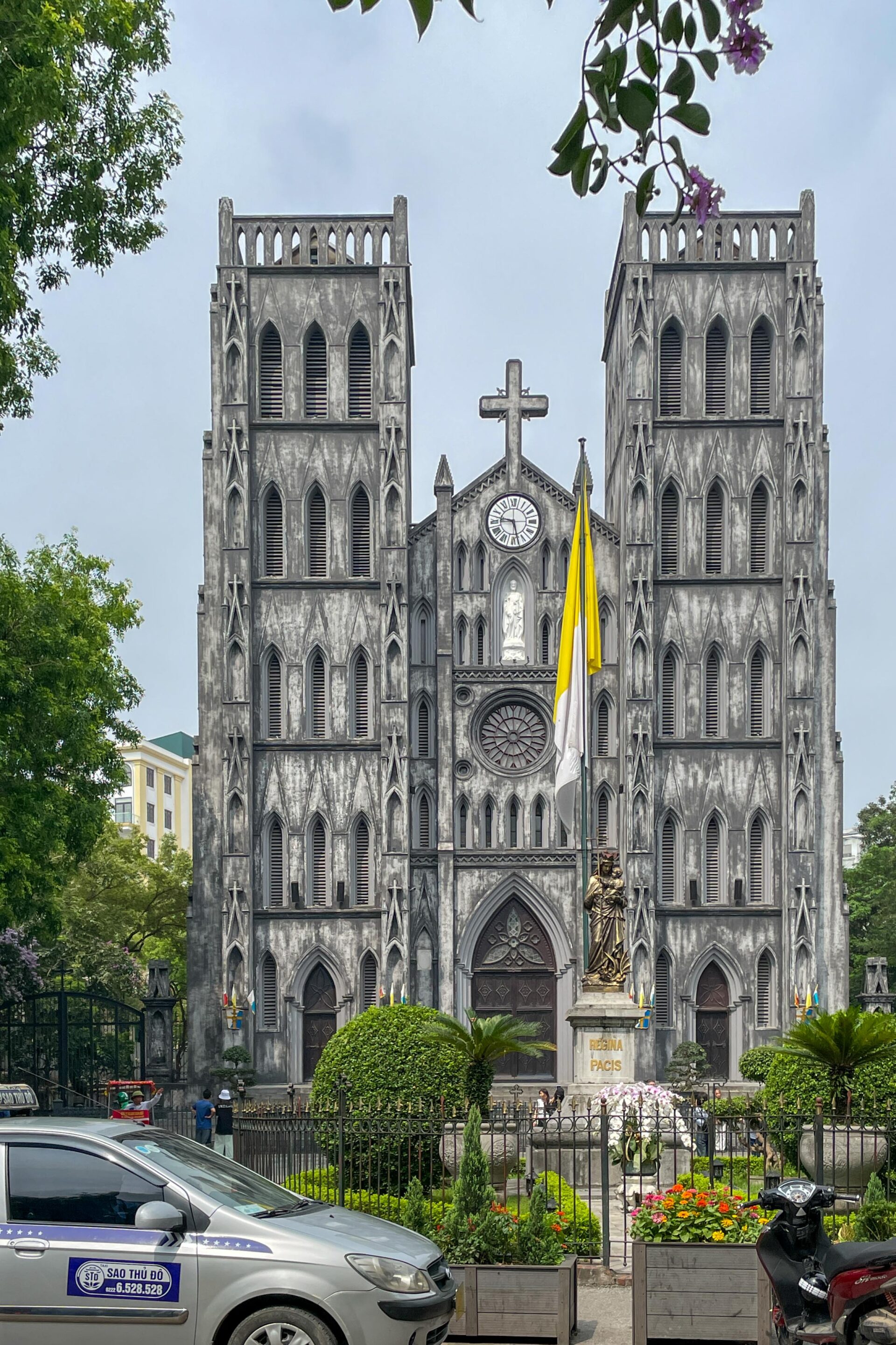 Langs het meer lopen we onder de fel lila gekleurde bomen op zoek naar de St. Jozef Kathedraal. Als je hier goed naar de gevels van de woningen kijkt, zie je dat hier geen “Tube Houses” staan maar bredere woningen in Franse stijl, voorzien van luiken en de o zo typerende Franse balkonnetjes.