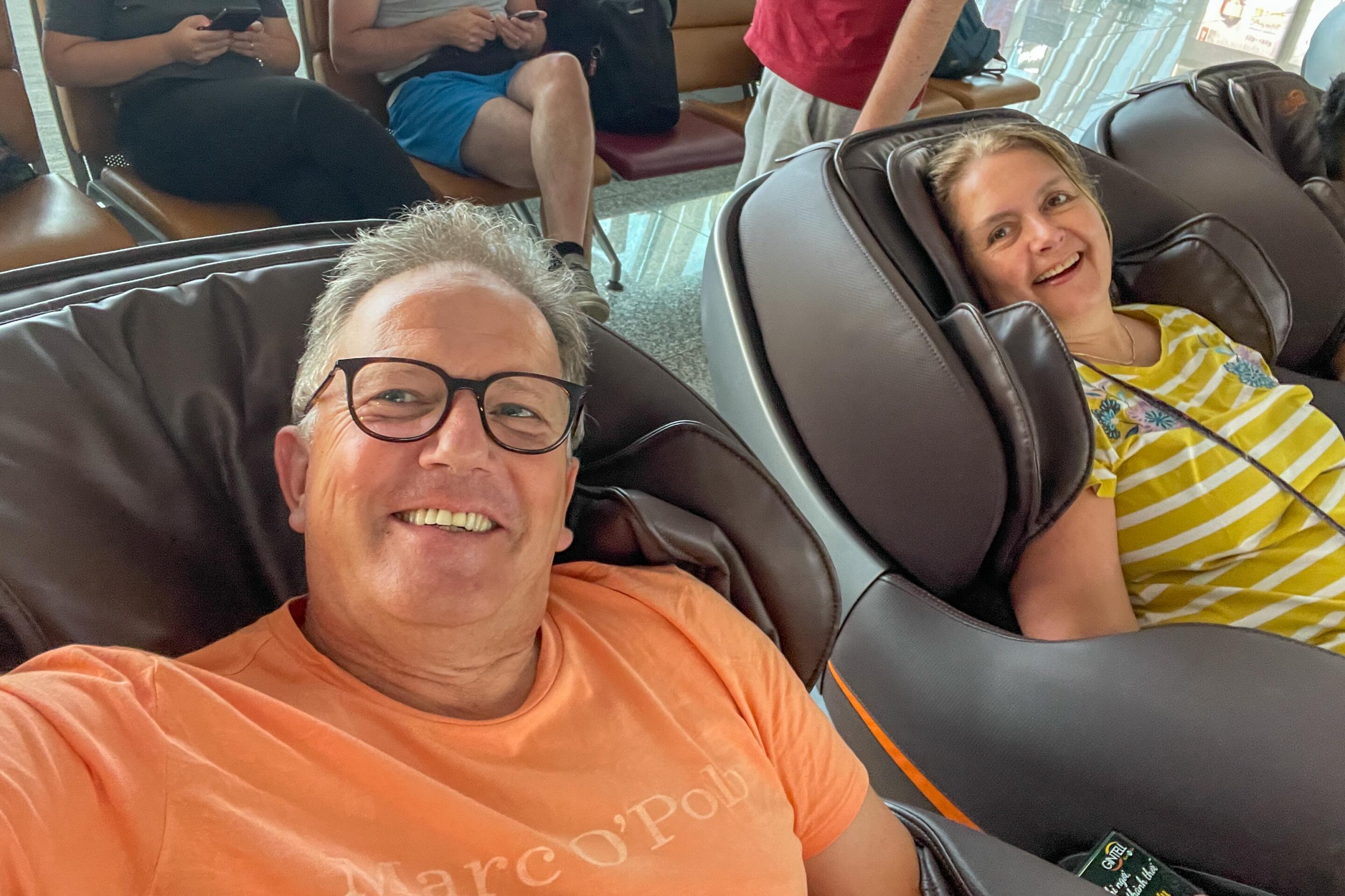 Niet veel later staat de taxi voor de deur om ons naar het vliegveld te brengen. Inchecken gaat snel en efficiënt, zoals we inmiddels wel gewend zijn van de Vietnamezen. We eten voor de laatste keer vietnamees en om de laatste centen op te maken trakteren we onszelf op een 10 minuten durende massage in één van de ultra moderne massagestoelen. Ik zeg, wat een marteling!