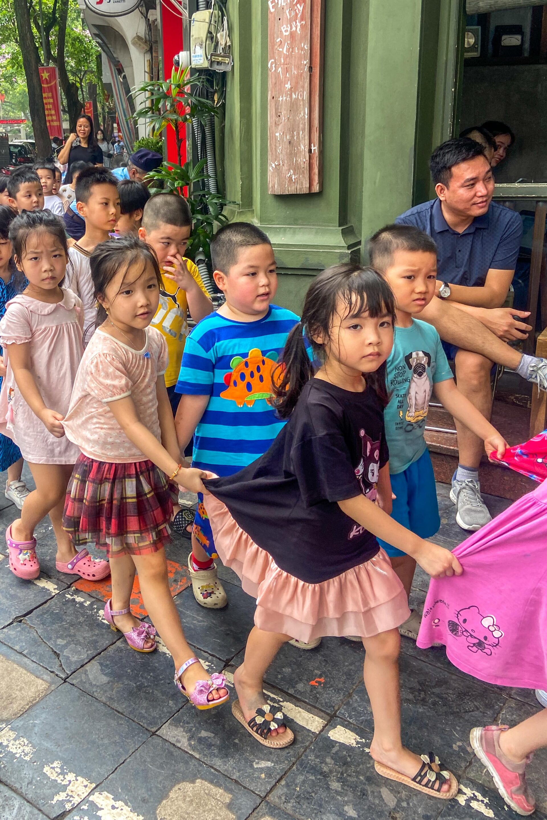 Vlakbij de kerk steekt een lange sliert kleuters onder begeleiding van diverse juffen de weg over met een onbekende bestemming voor ons. We zien ook groepen kinderen precies de andere kant op lopen, zeg maar het “wisselen van de wacht”.