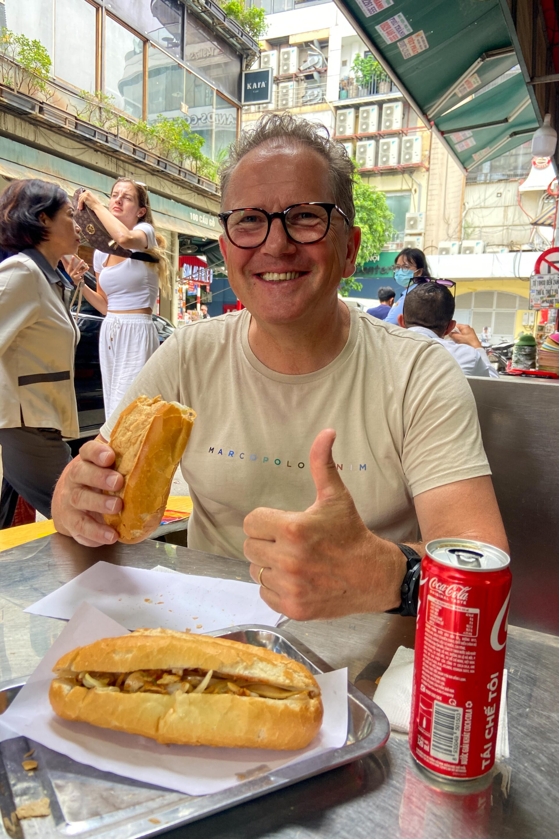 Tussen de middag eten we een broodje Banh Mi Ga. in ons favoriete straatrestaurantje De geroosterde kip met groente op een broodje van graan en rijst smaakt ons prima.