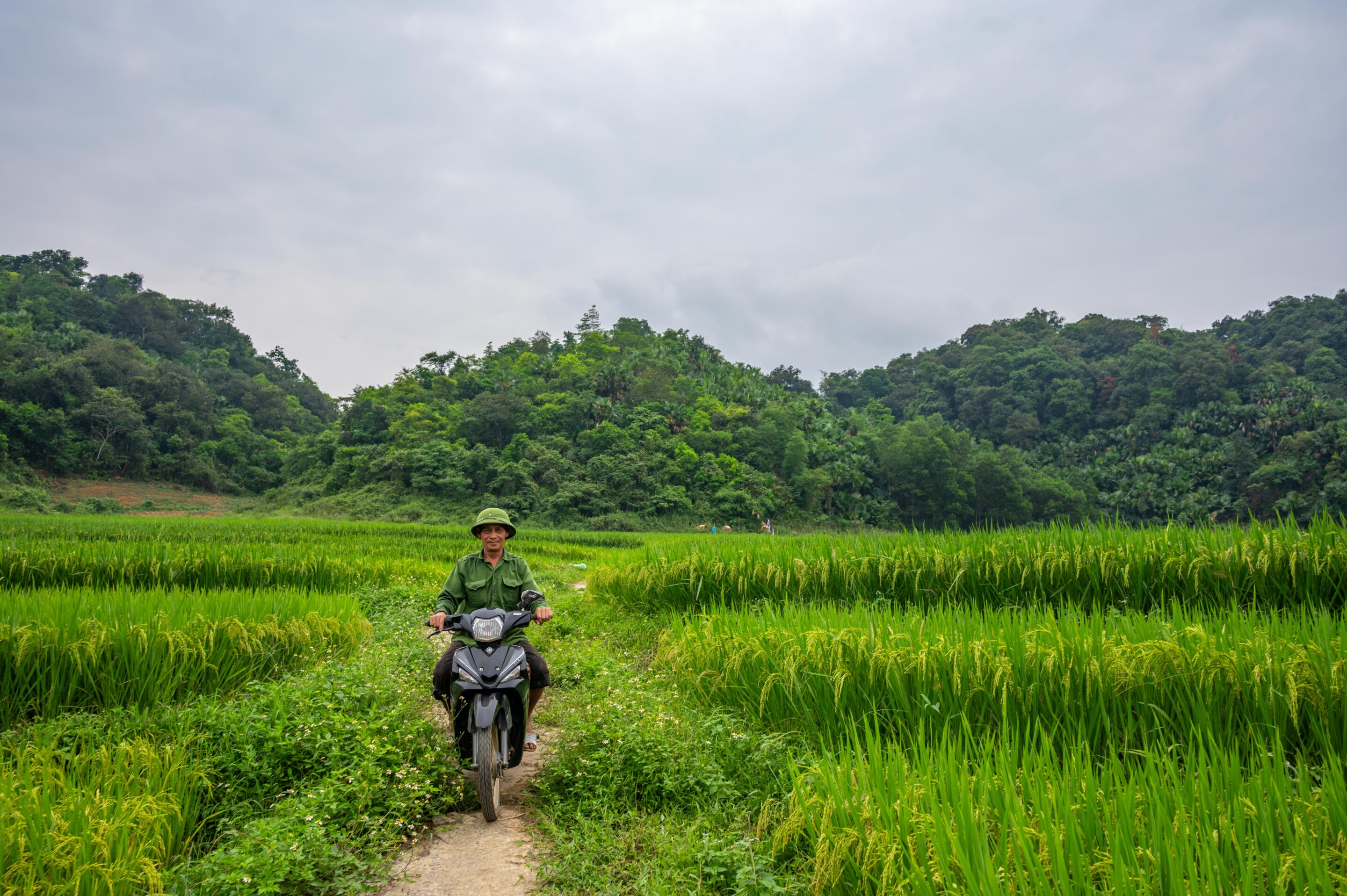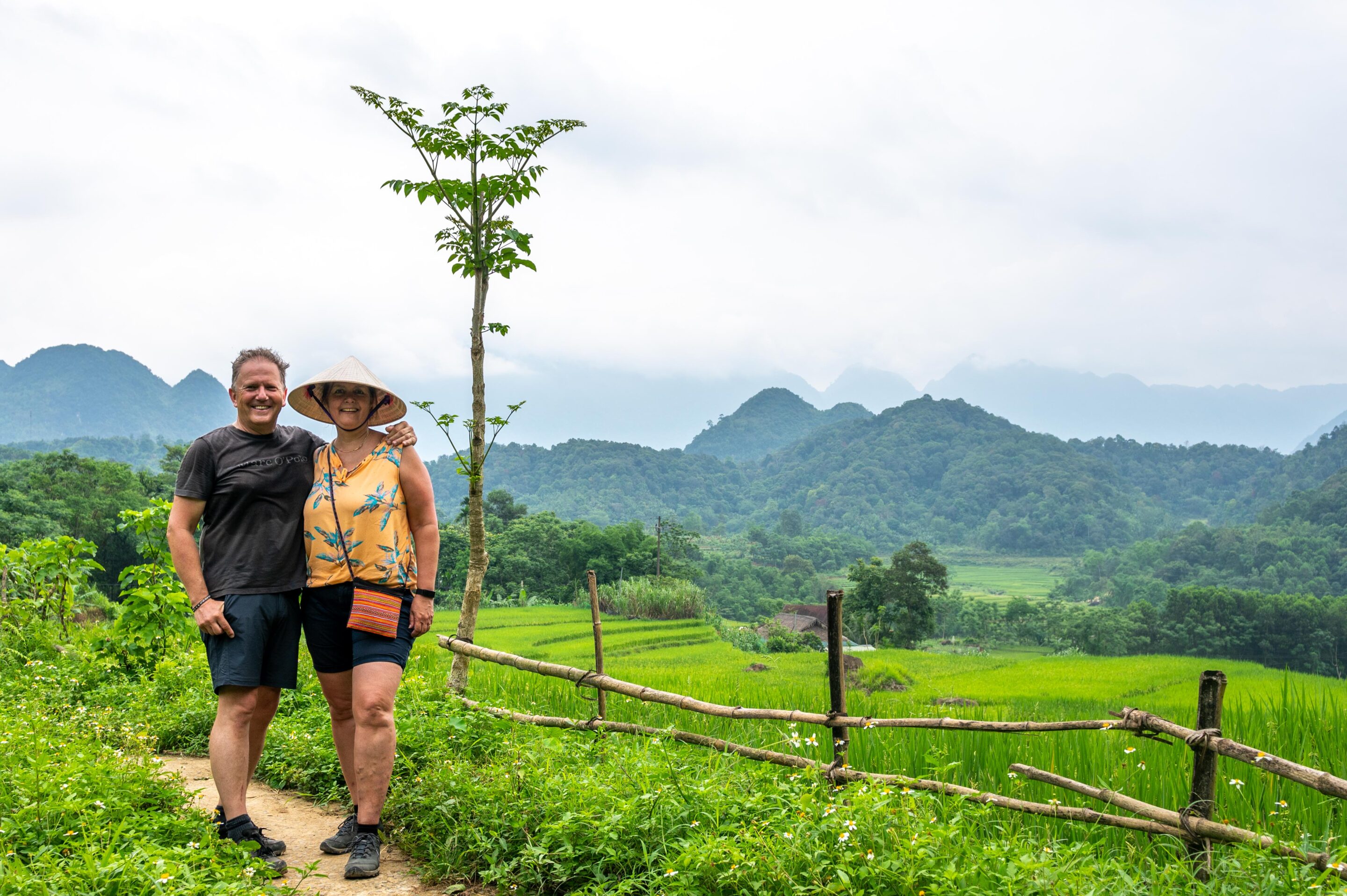 We rijden met onze privé chauffeur in een gloednieuwe Isuzu terreinwagen -alles ruikt namelijk binnen nog als nieuw- naar Pu Luong. Wederom een niet Engels sprekende chauffeur maar ditmaal geen gebel en ander luid gedoe. De o zo vriendelijke man wil zelfs een paar keer stoppen voor ons om een foto te maken. Als we aankomen in Pu Luong wil hij graag met ons op de foto. Trots als een aap waarschijnlijk om met ons op de foto te staan!