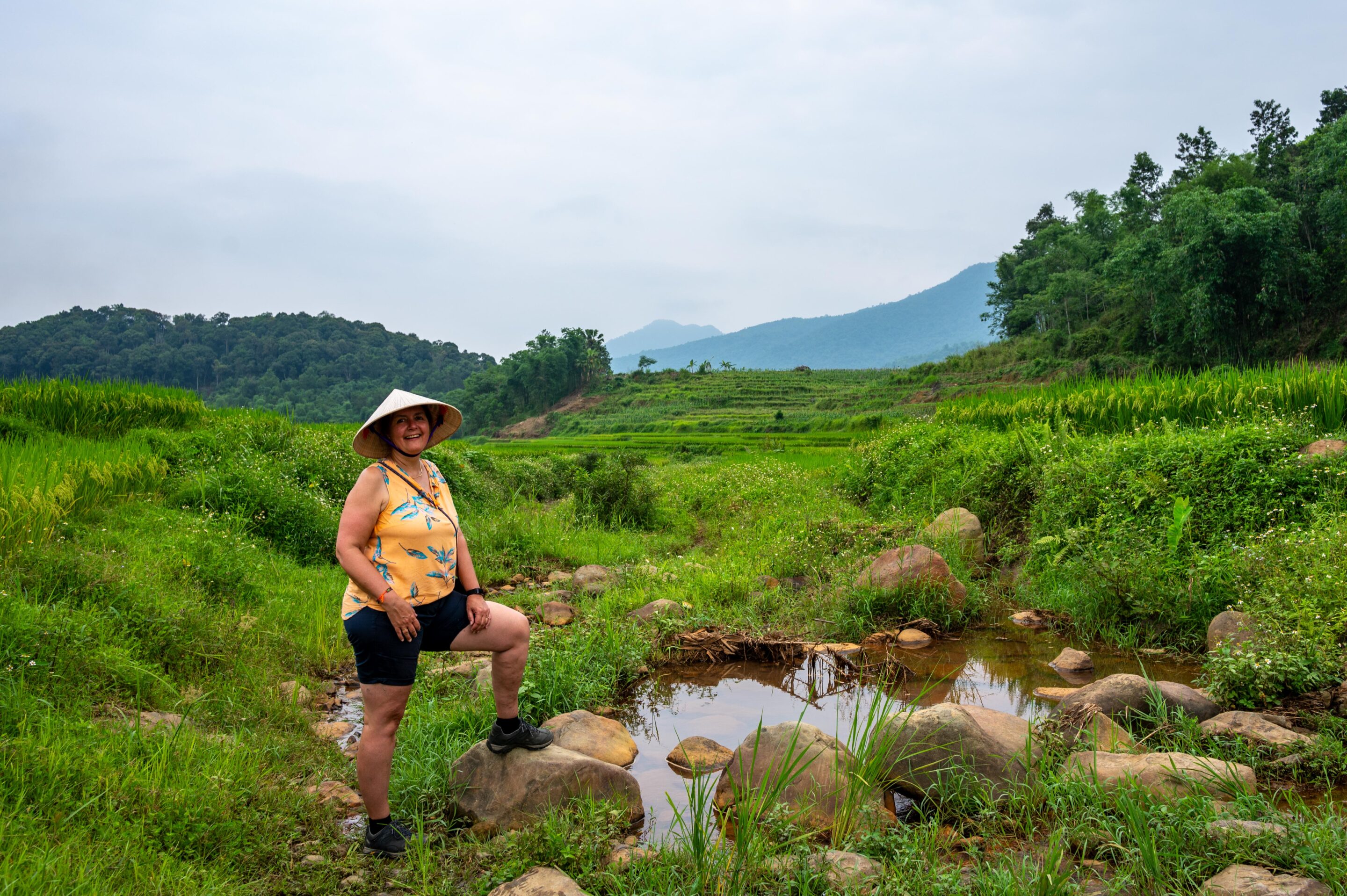 Na de lunch staat er een wandeling van 5 à 6 km op het menu. Onze gids “Quoc” staat al op ons te wachten. Hij spreekt redelijk Engels maar belangrijker: hij is gezellig en heeft gevoel voor humor.