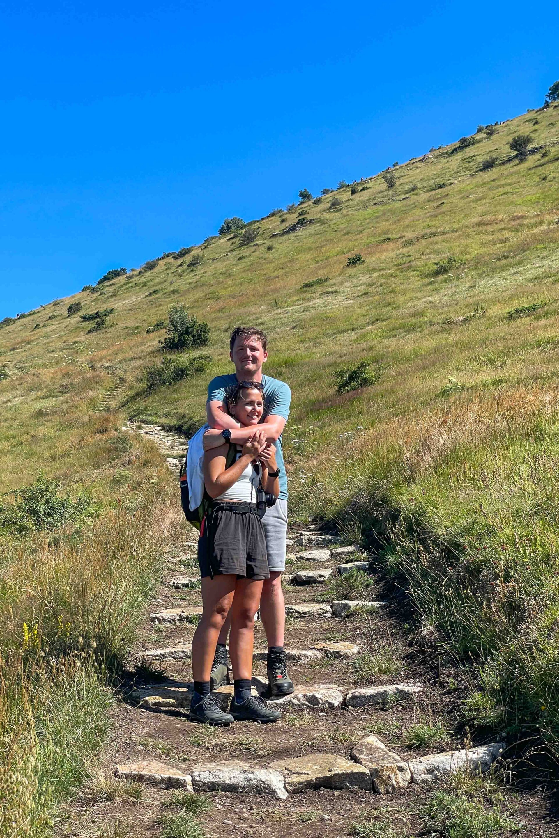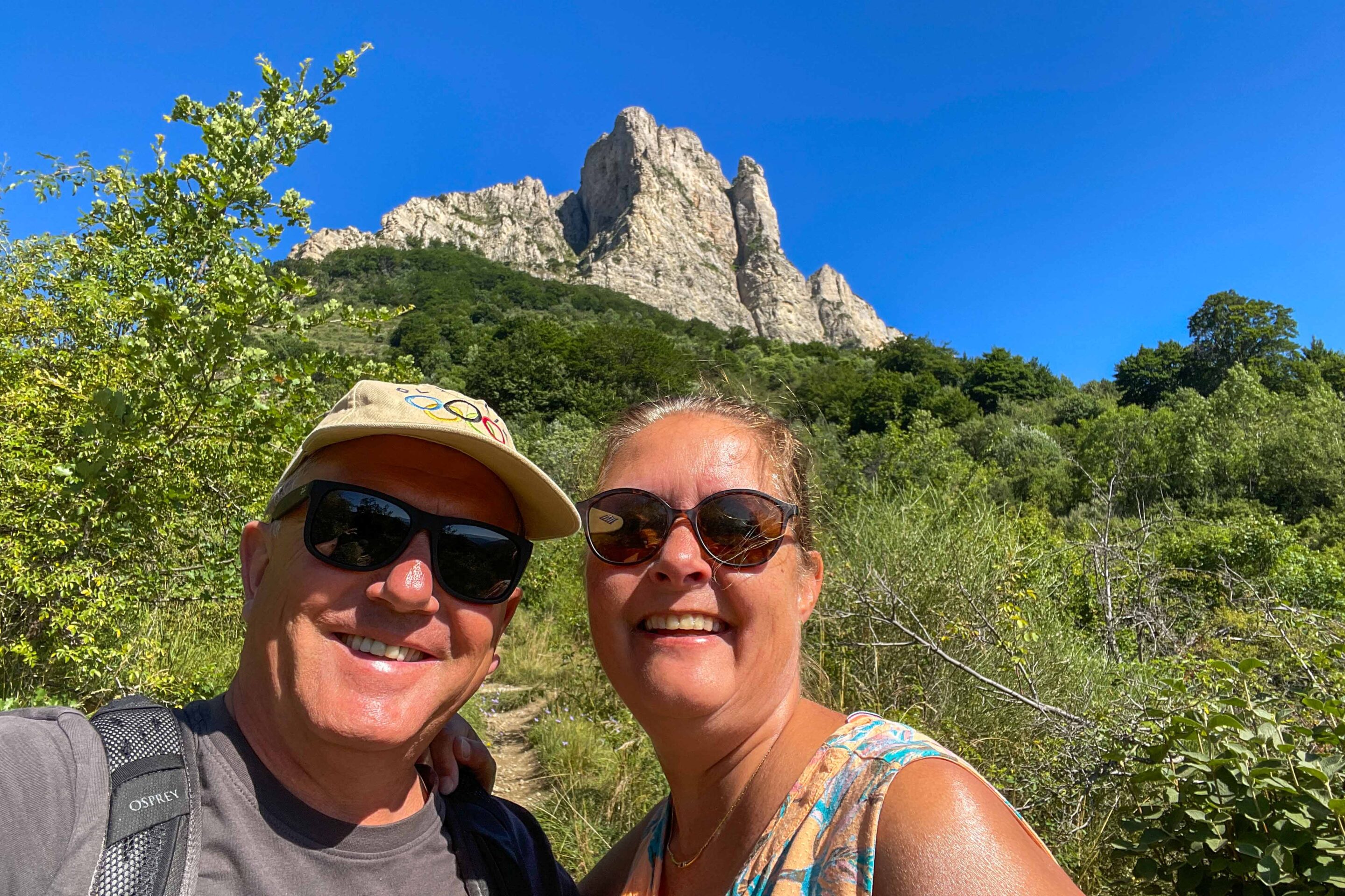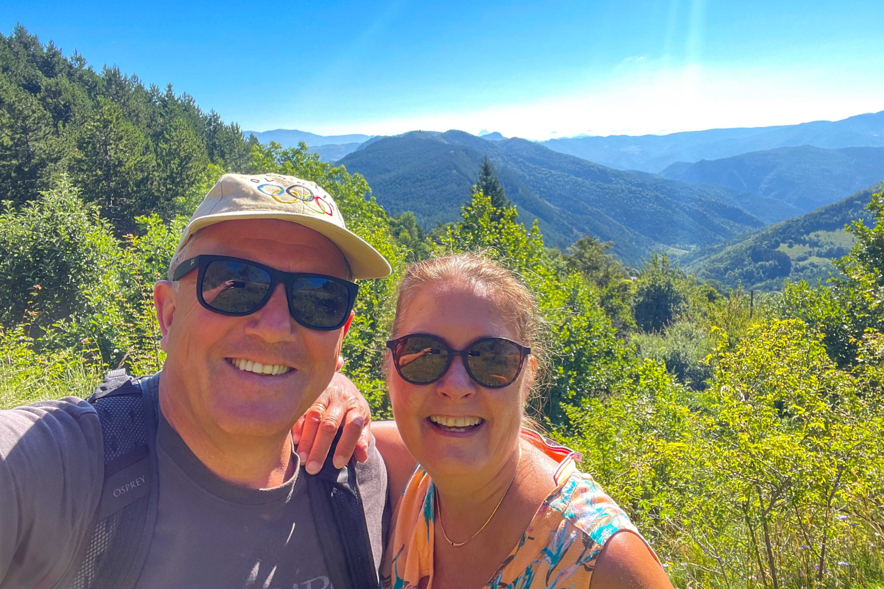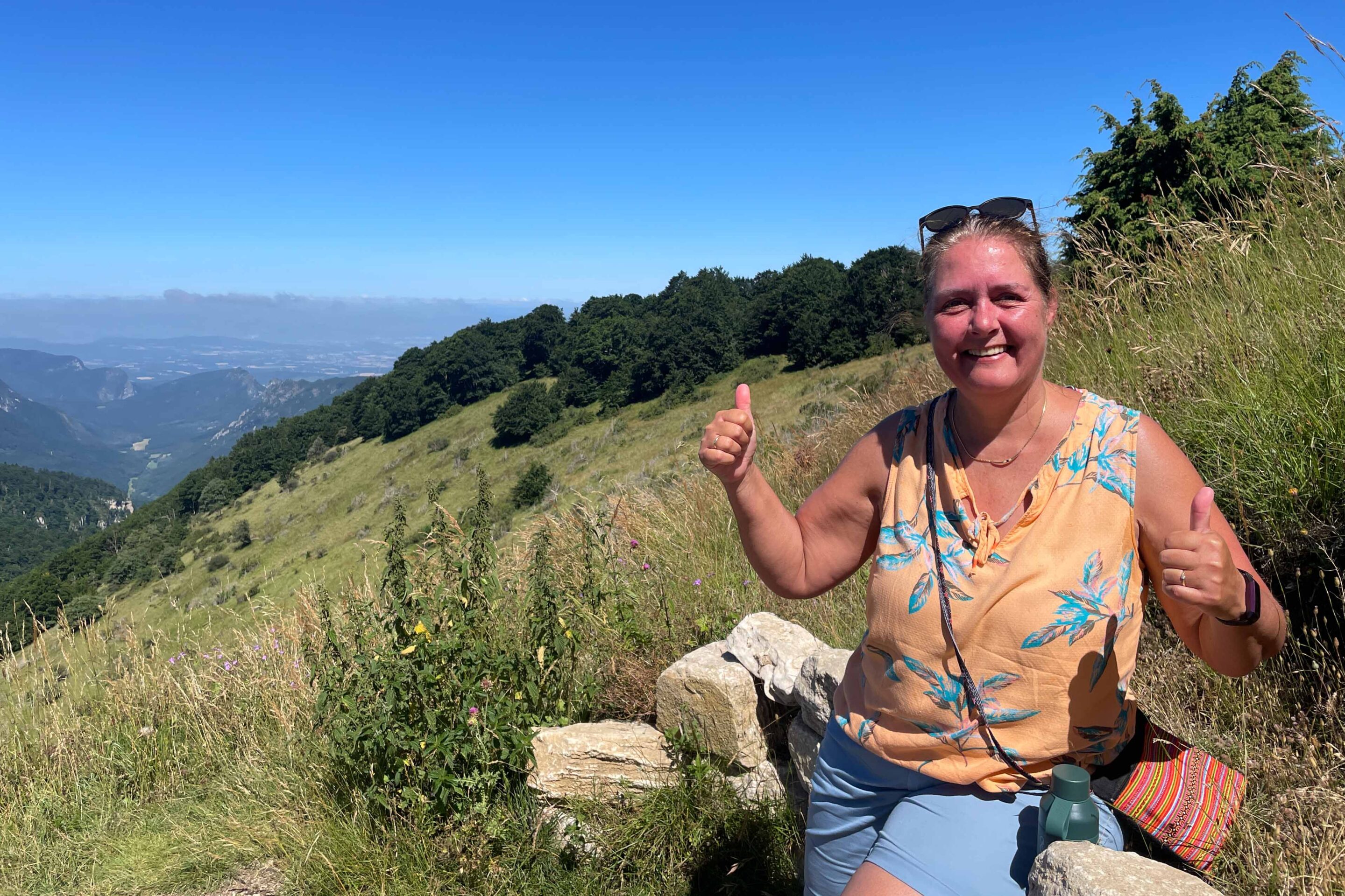 De klim naar de top van de Le Veyou (1.589m) gaat over zo’n 576m en is steil en pittig. We treffen geen echt traditionele bergpad aan maar een kilometers lang uit stenen gemaakte “trap” naar boven. Stairway To Heaven is er niets bij… Robert en Jytte hebben “goeie benen” en klimmen in “no time” de berg op. Gelukkig wordt er ook nog wel eens gewacht op de twee oudjes..