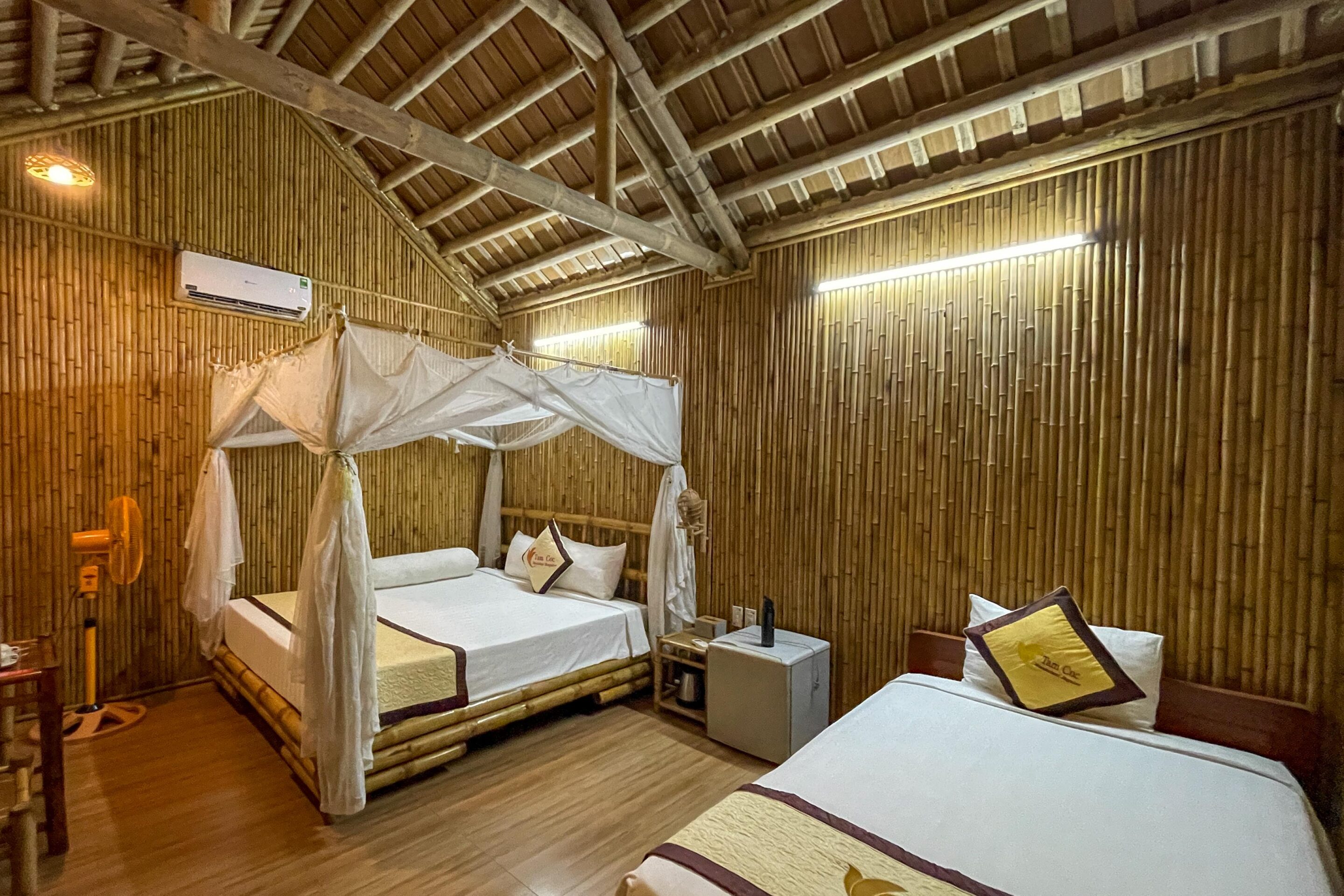 Deze vriendelijkheid is toch wel kenmerkend voor Vietnam. Na het inchecken lopen we naar onze kamer. We kunnen hier met een beetje passen en meten wel met z’n vieren slapen. Airco, bamboo muurdecoratie, klamboe en een nette badkamer. We hebben hier zelfs een zwembad. ik zeg “douze points” om alvast in de songfestival-stemming te komen.