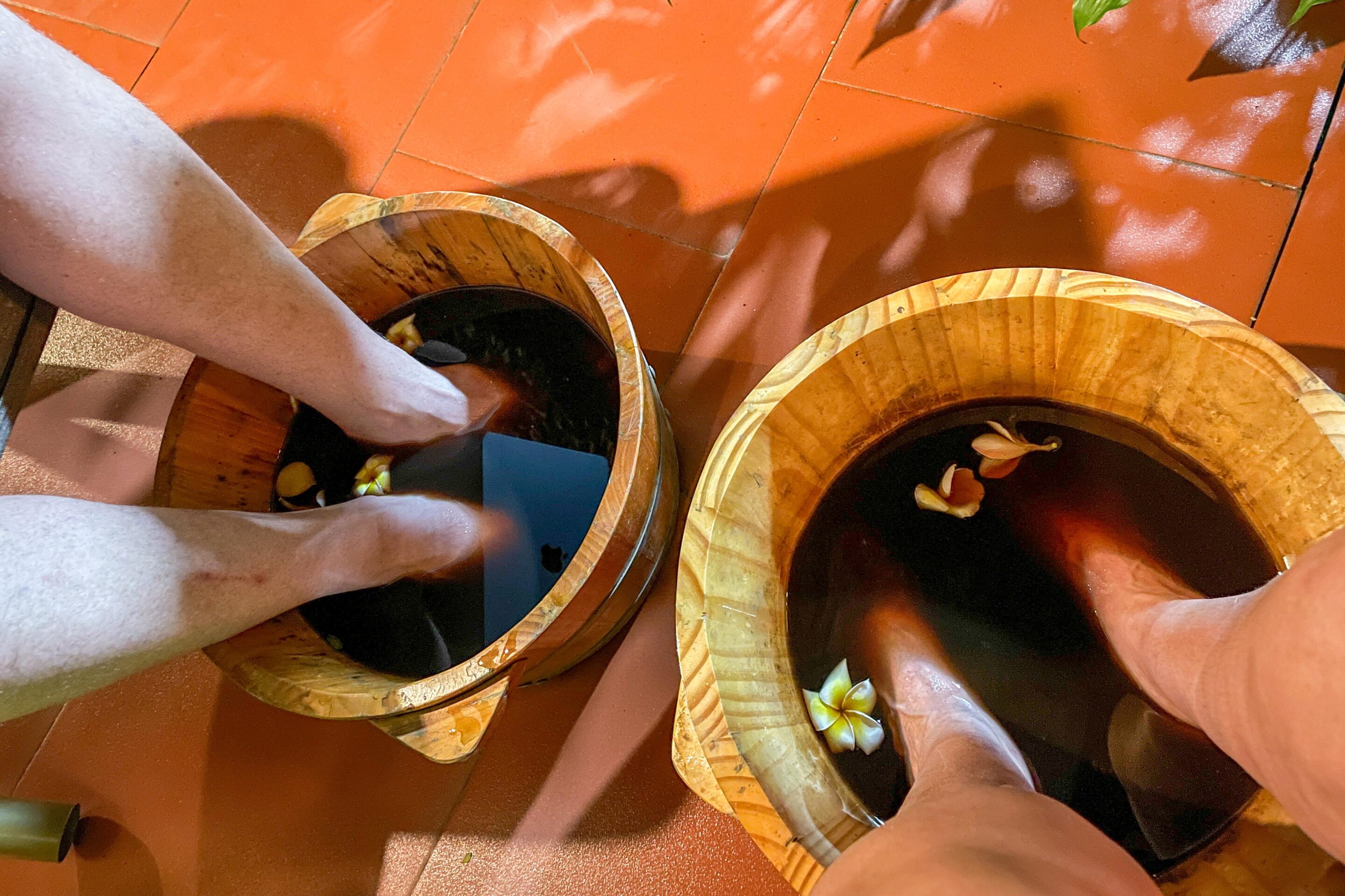 Rond 20:00 uur krijgen we een voetenbad op basis van kruidenextracten. Wederom krijgen we er iets te drinken bij, ditmaal een glas thee. Maar vooral heerlijk dat onze voeten ook even verwend worden, die zijn daar best wel even aan toe.