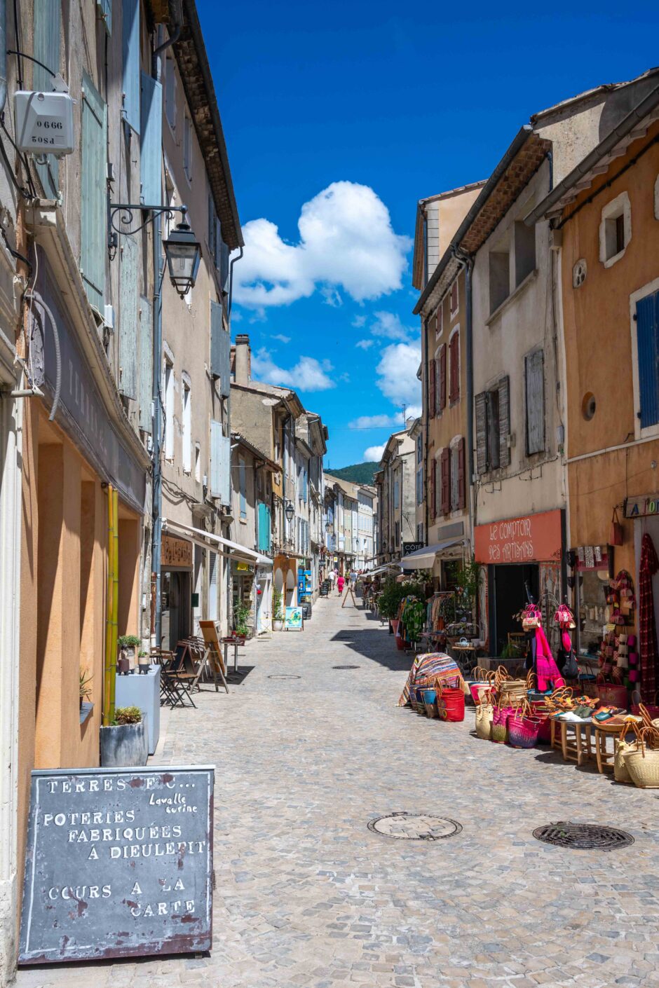 De volgende stop is in Dieulefit, de stad van kunst en historie. We komen midden op de dag aan in Dieulefit. Over zon en warmte hebben we niets te klagen hier.  We lopen op ons gemak in de schaduw door de kronkelende straatjes van het oude deel van het dorp, “La Viale” langs oude huizen met de kenmerkende bleekrode pannendaken. Uiteraard wordt traditioneel de kerk bezocht door ons. Al twee eeuwen lang is Dieulefit bekend om haar pottenbakkerijen. Tegenwoordig houdt een dertigtal pottenbakkers en ceramisch kunstenaars deze traditie nog in stand.