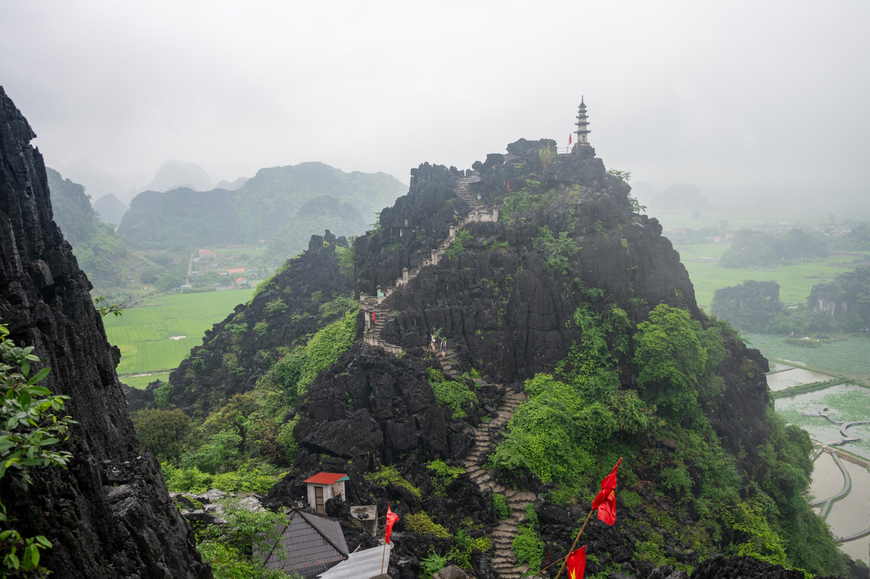 Als het eenmaal redelijk droog is gaan we vlot door naar boven. Op de top is een mooi uitkijkpunt op de Tam Coc vallei. Helaas is het zicht beperkt door de wolken en de regen. We worden plotseling weer getrakteerd op een felle tropische bui. We schuilen even bij Boeddha en bidden gelijk voor een veilige afdaling, de rotsen zijn namelijk spekglad geworden door de regen