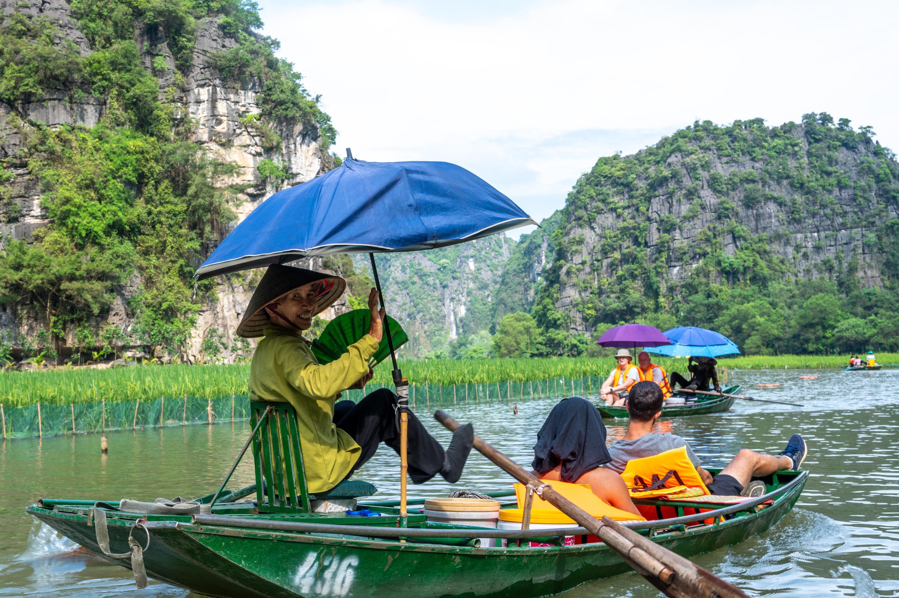 Het slotstuk van de dag is een anderhalfuur durende boottocht. Terwijl wij op een houten bankje zitten, roeit onze roeier de boot behendig de Tam Coc rivier af. Deze roeiers kunnen roeien met hun handen èn benen. Wij hebben het niet geprobeerd maar ik vermoed dat we wel een maand of wat nodig hebben om de boot überhaupt voorwaarts te kunnen bewegen.