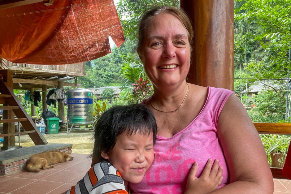 Als we eenmaal het hoogste punt van onze route bereikt hebben, rusten we uit bij een in aanbouw zijnde boerderij. De mensen nodigen ons gastvrij uit om in de schaduw en onder de woning aan tafel plaats te nemen. Deze gastvrijheid is echt wel kenmerkend voor Vietnam.